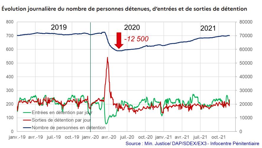 - Depuis juin 2020, la population carcérale repart très fortement à la hausse en France, après une baisse exceptionnelle lors de la première vague du Covid-19. Le début de la crise du Covid a en effet marqué une chute historique du nombre de détenus au second trimestre 2020. Sur les mois d’avril à juin 2020, le nombre de détenus a baissé de 13 000, soit -20 % par rapport au niveau du 1er mars 2020. L’explication vient pour moitié du fort ralentissement des entrées en prison et pour l’autre moitié de la forte accélération des libérations. Le 25 mars 2020, le Ministère de la Justice a publié une ordonnance incitant les magistrats à aller dans ce sens, en promouvant les alternatives à l’incarcération et les réductions de peine supplémentaires pour motif sanitaire. Au-delà, l’épidémie a contraint les tribunaux à passer au télétravail et à annuler nombre d’audiences. Cette activité réduite a mécaniquement ralenti le flux d’entrées en détention.